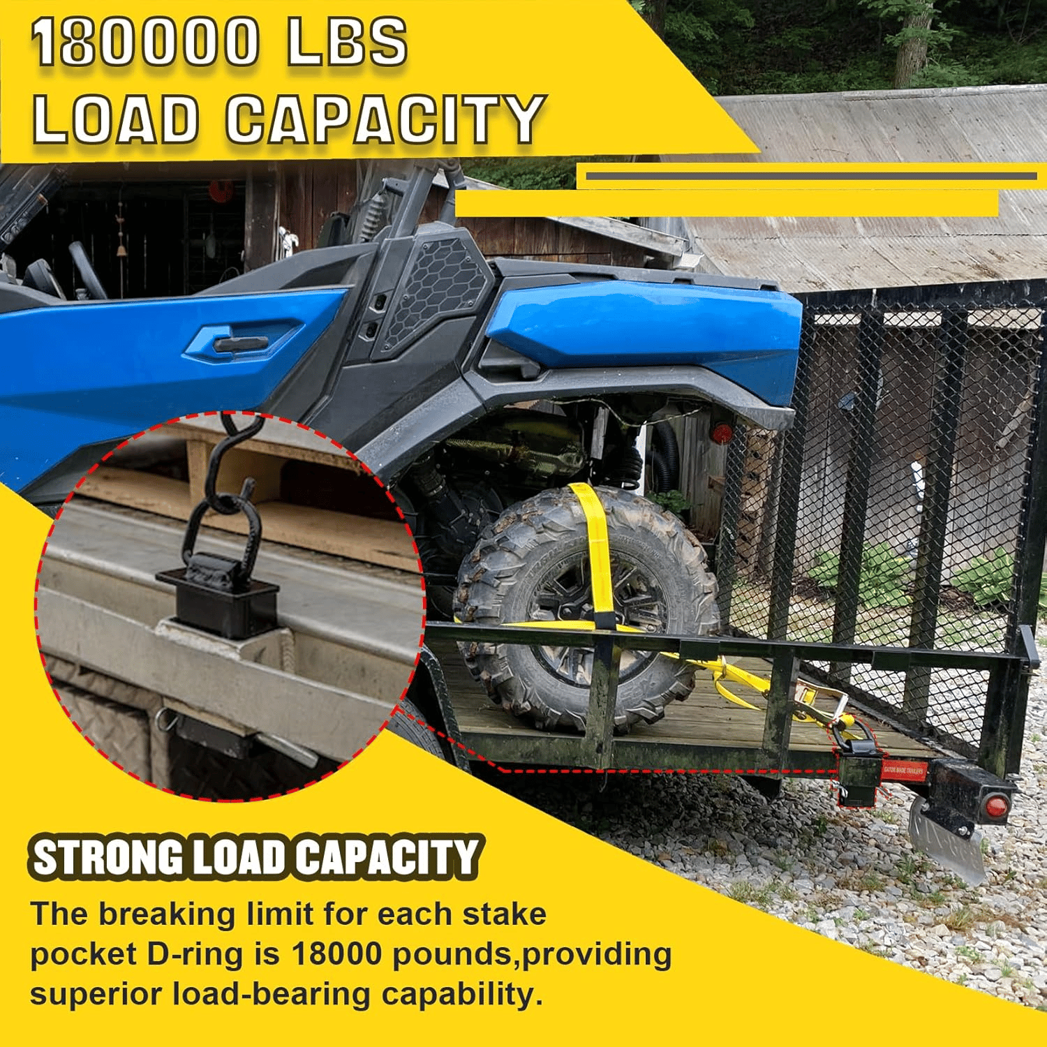 This trailer stake pocket d ring for stake pockets boasts a remarkable breaking strength of 18,000 lbs and a working load limit of 5,400 lbs. It includes a bolt and hitch combination for secure attachment to your truck or trailer stake pocket