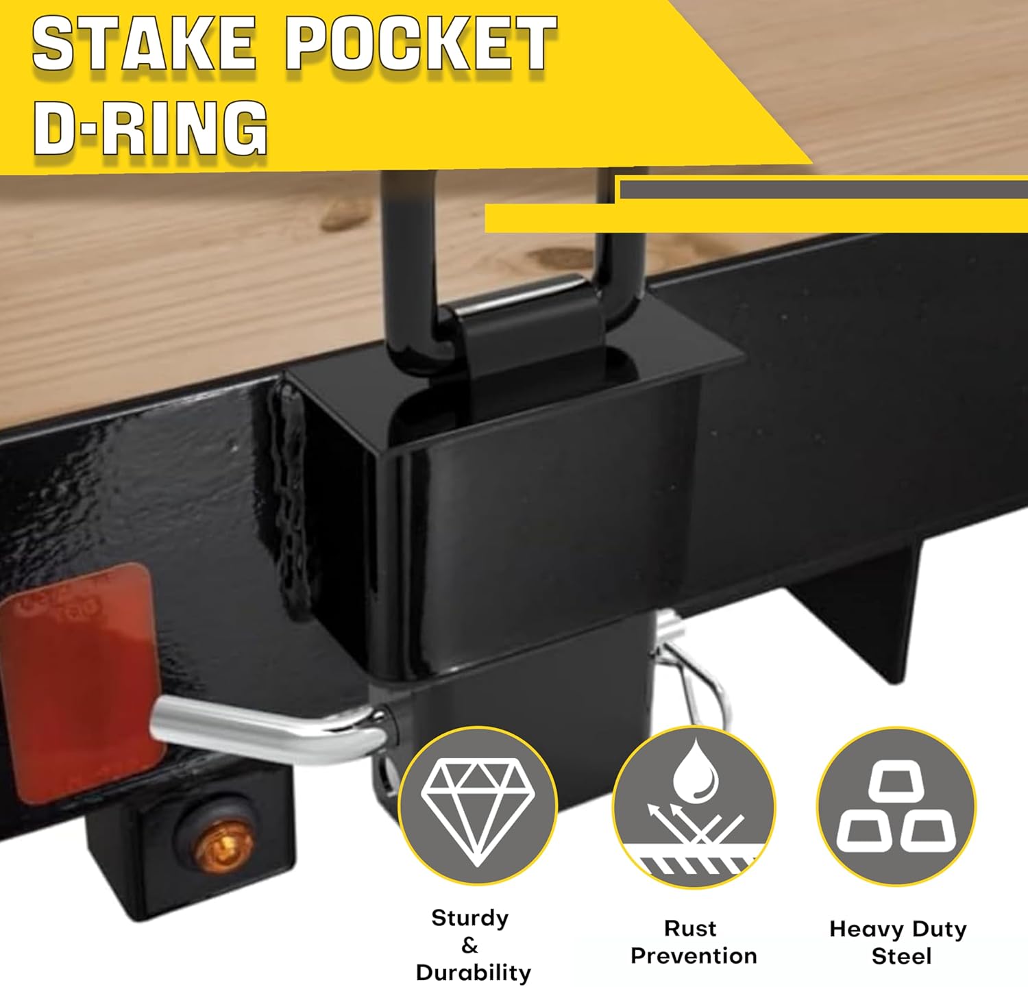 Our D-Ring Stake Pocket Tie Down stands out from the competition due to its unmatched strength and ease of installation. With solid steel construction and a weather-resistant powder coating, you’ll have a dependable tie-down that handles even the toughest loads. Whether you're hauling on a utility trailer or securing cargo on a flatbed truck, our tie-down offers versatile, high-performance load security that fits your needs.