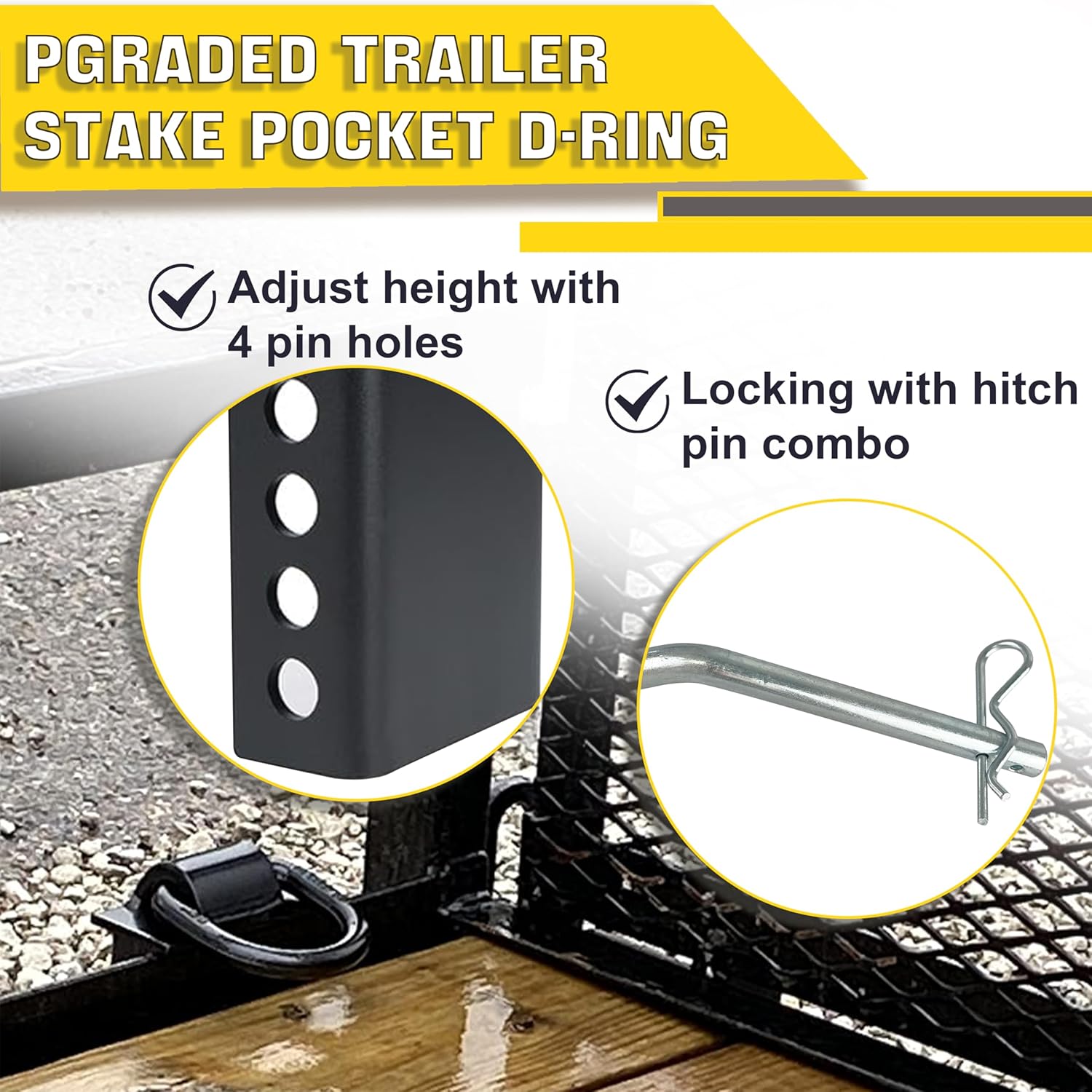 This D-Ring Stake Pocket features 4 pin holes to precisely position the pin spacing to ensure a perfect fit for your stacking bag. ensuring compatibility with a wide range of utility trailers and trucks.Please be sure to measure before you purchase